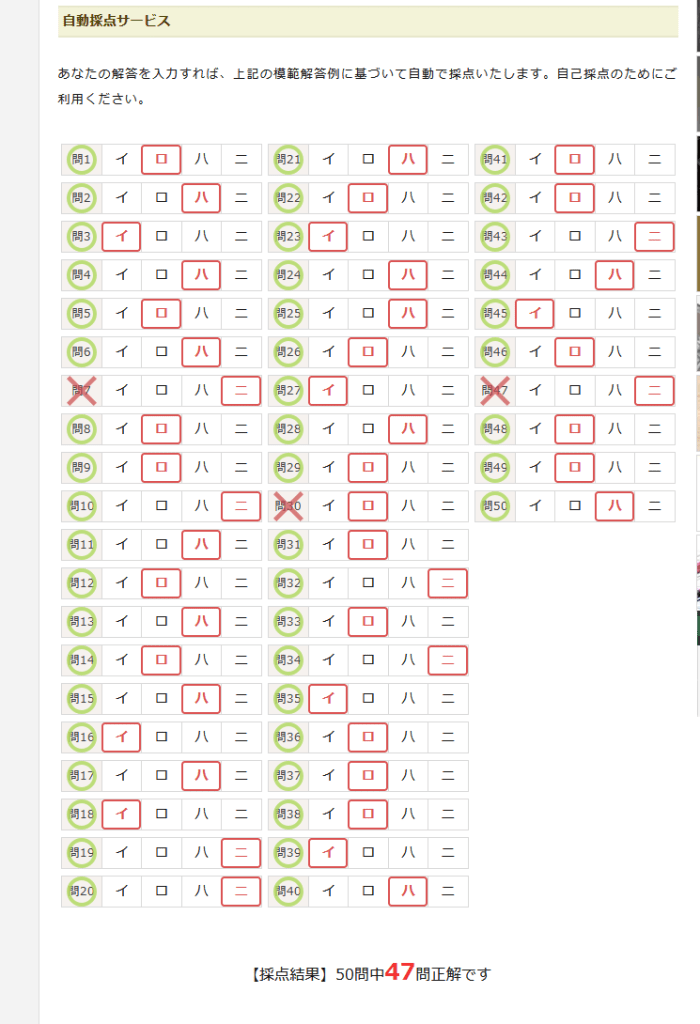 帰宅後、自己採点のサイトでチェックしたら47問正解だったので、これは大丈夫だろうと安心しました。