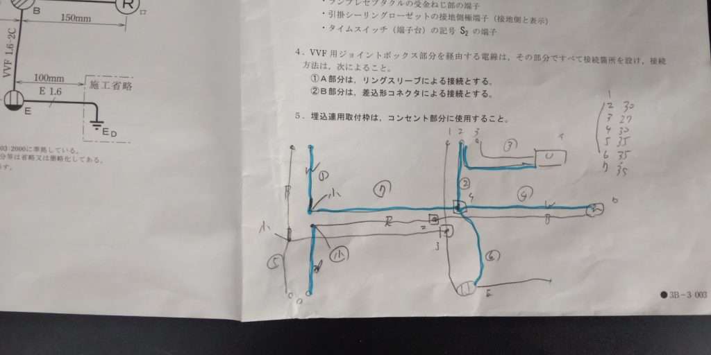 いよいよ、11:30に試験開始。問題用紙をめくって戸惑ったのが複線図を描くスペースが小さいこと。上で書いたように、見開きにあるはずのA5程度のスペースに複線図を書くイメージで練習してましたが、そんなスペースはどこにも無い。裏の1ページが丸々空いていましたが、裏だと用紙を捲りながら書かないといけないので非常にやりづらい。机の上に敷いている厚紙にも書き込み可能とのことでしたが、私は慣れないことは避けたかったので見開き下の狭いスペースに無理やり複線図を書きました。