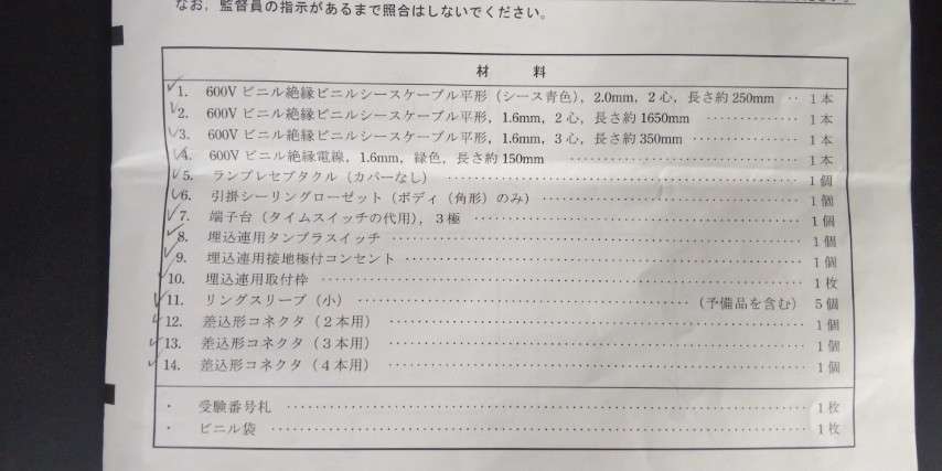 試験の説明が終わったら問題用紙と、材料が入った箱が配布されます。問題用紙の材料リストを見るとタイムスイッチがあったので、すぐに問題No.3と確定。頭の中で部材の配置と結線をイメージしました。